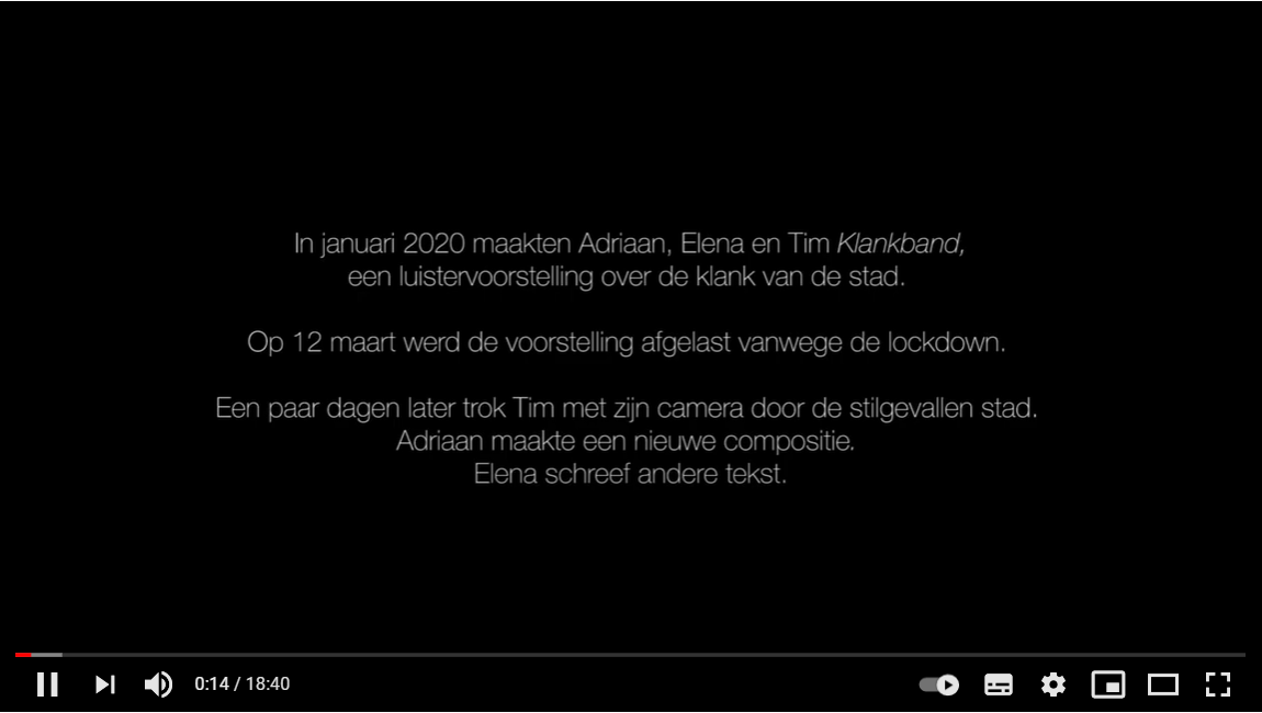 In het voorjaar van 2020 maakten Adriaan Severins, Elena Peeters en Tim Clement de voorstelling Klankband, een luistervoorstelling over de klank van de stad.